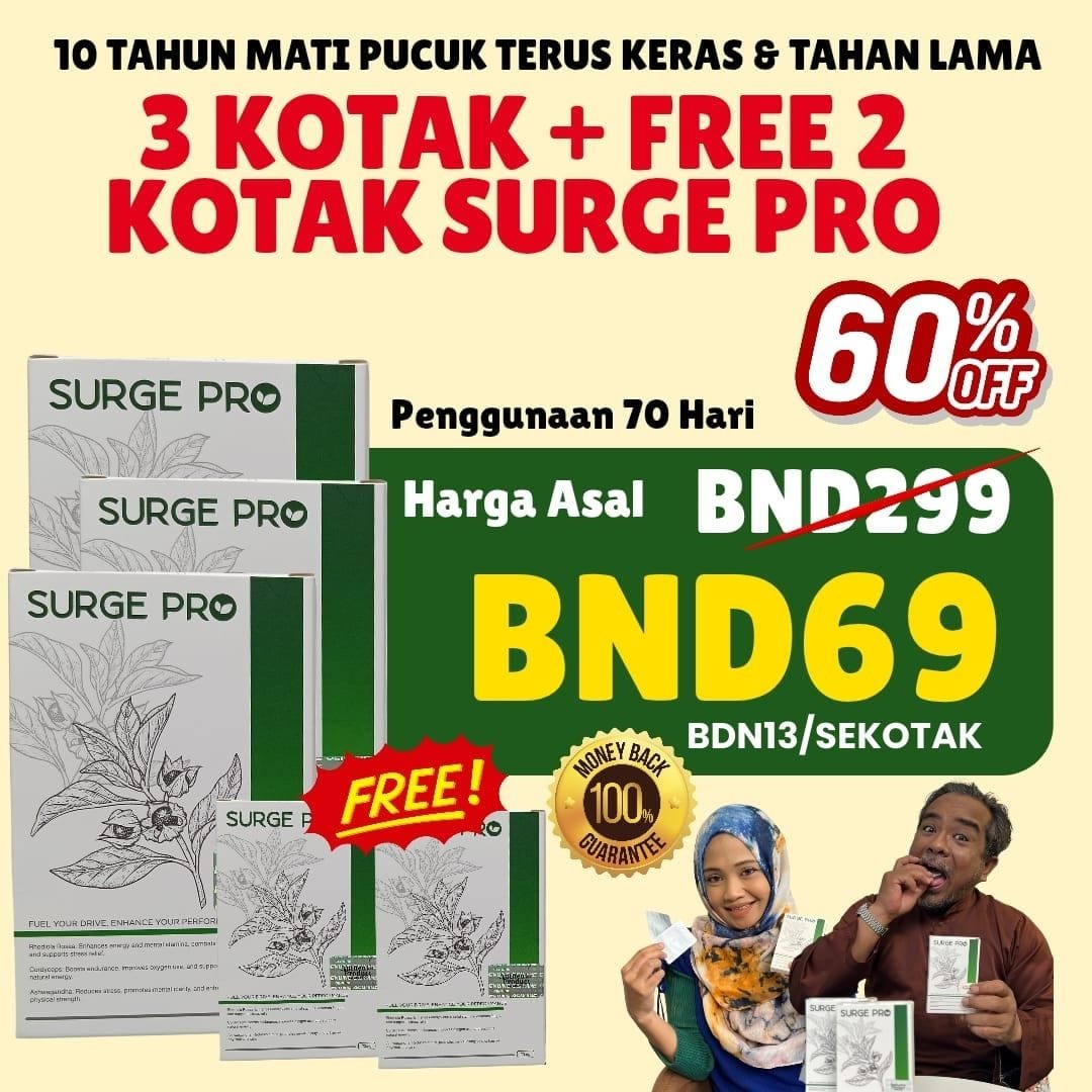 Pilihpakej promosi paling jimat yang kami tawarkan. Promosi BUY 3 FREE 2 adalah terhad untuk masa yang ditetapkan sahaja. KAMI JAMIN SURGE PRO MAMPU SELESAIKAN MASALAH ANDA. Jangan risau.. jika Surge Pro tak berkesan untuk anda, kami pulangkan wang anda 100% tanpa banyak soal.